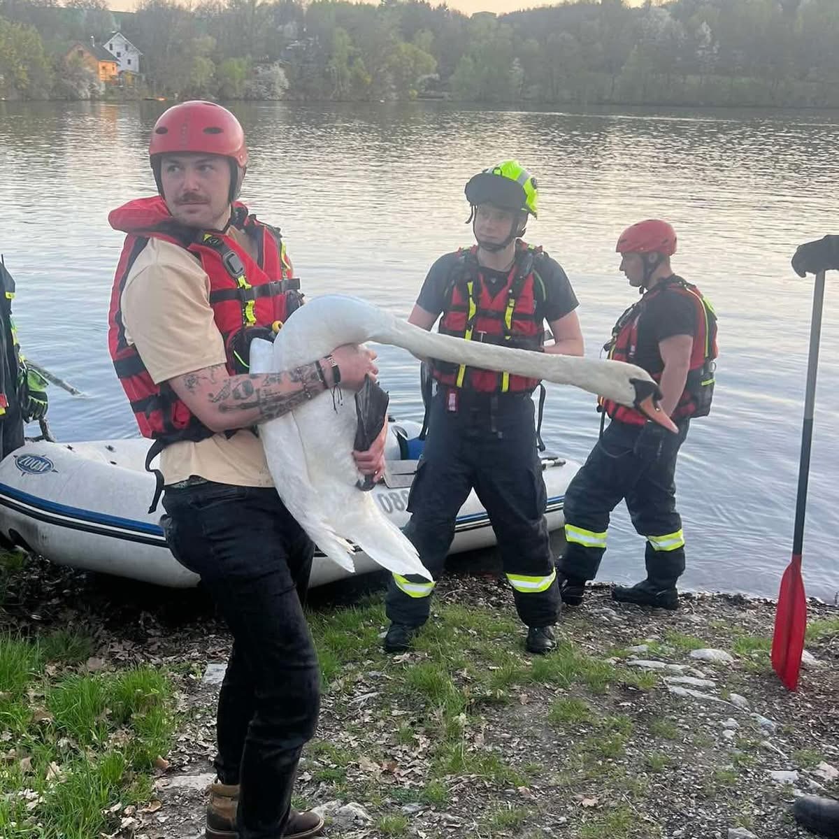 Jednalo se o velký rybník a labuť byla jinak pohyblivá. Proto museli zavolat na pomoc hasiče.